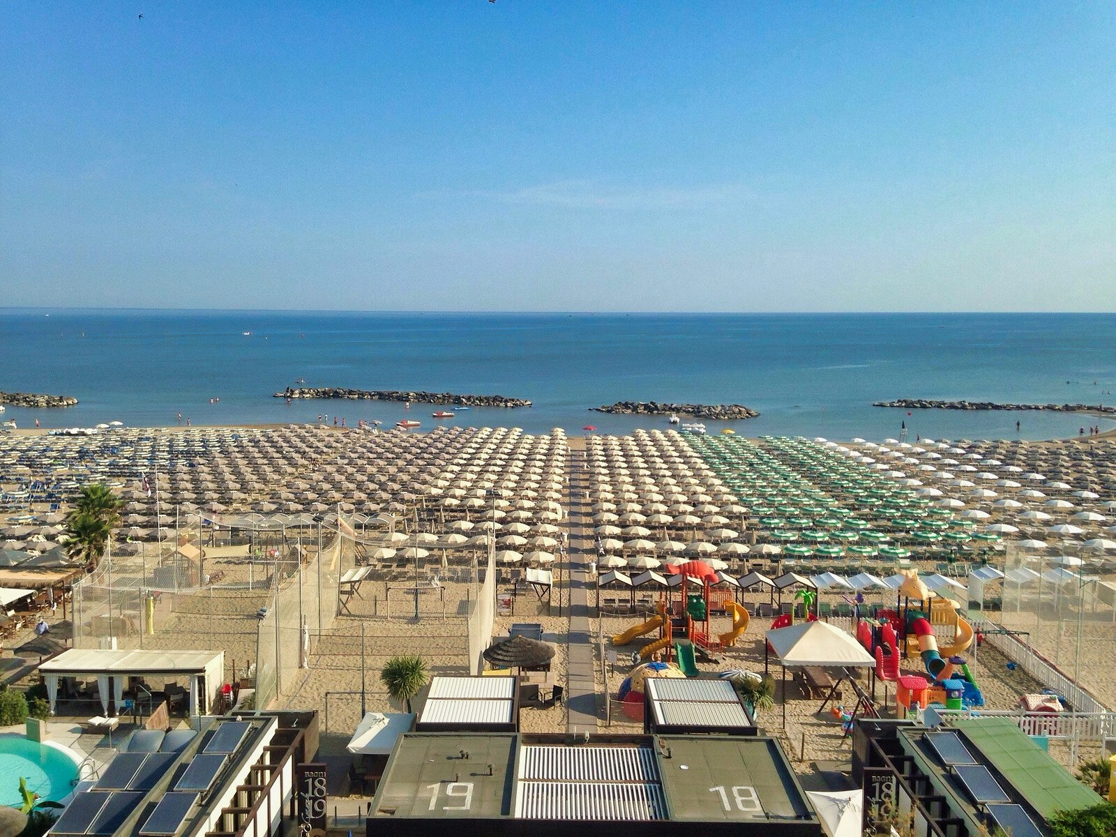 1 ombrellone + 2 lettini per camera doppia, massimo 2 lettini per camera; 1 ombrellone + 1 lettino per la camera singola, uso della cabina al mare presso i bagni di sabbia finissima Golden Beach o Sunshine, attrezzati con bar, giochi, piscina, bocce, beach volley, basket, attività di animazione, baby club.