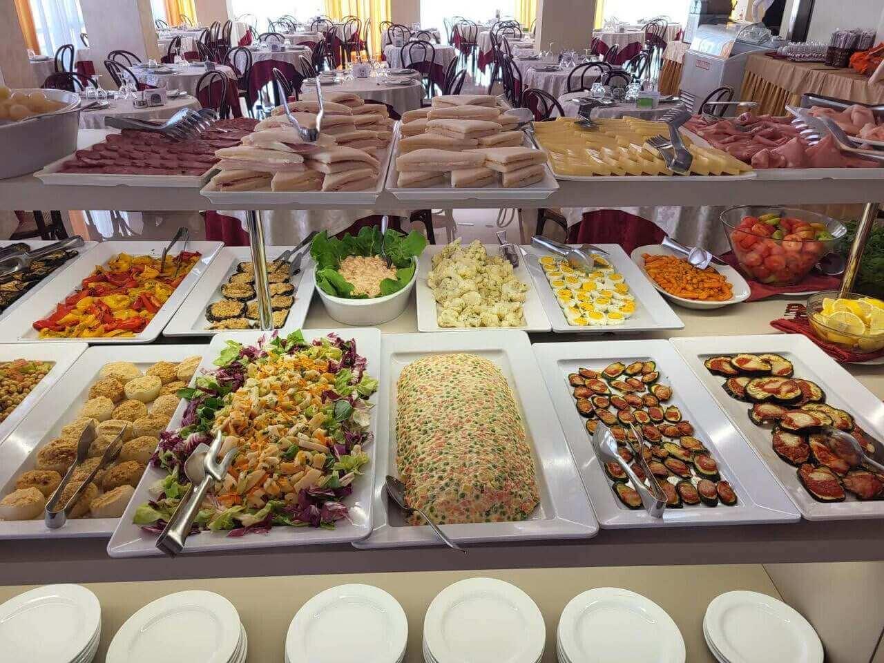 Colazione a buffet servita; pranzo e cena con 4 menù a scelta, antipasti caldi e freddi, verdure e golosi buffet con torte fatte in casa, frutta fresca e dessert; acqua, vino della casa ai pasti.