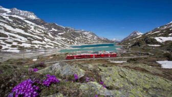 Via Passo del Tonale e Valcamonica arrivo a Tirano (429 m) e partenza in posti riservati con il mitico Trenino Rosso del Bernina. Attivo da ben 116 anni, dal 2008 Patrimonio Mondiale dell’Umanità. È una delle tratte ferroviarie montane più spettacolari e tra le più alte d’Europa, tra panorami mozzafiato e ghiacciai perenni. Attraverso un ambiente tipicamente alpino si raggiunge la Val di Poschiavo, dove la ferrovia sfiora letteralmente le case e la strada principale; a Brusio il trenino effettua un percorso a forma di cerchio per prendere quota in poco spazio, quindi si costeggia il lago di Poschiavo. E poi la spettacolare salita al Passo Bernina (2.256 m), il punto più alto del percorso, con il Lago Bianco, in cui si specchiano i ghiacciai del Piz Palù; si scende verso Sankt Moritz (1.822 m), circondati da uno scenario di montagne che sfiorano i 4.000 metri, sulle quali svetta il Pizzo Bernina. Passeggiata (circa un’ora) nella mondana località turistica dell’Engadina conosciuta in tutto il mondo, adagiata presso un laghetto tra prati e foreste. Continuazione per Livigno (1.816 m), nel bellissimo fondovalle dello Spoel, in zona extra-doganale già dal 1805 e tempo libero per lo shopping (circa 2 ore). Rientro via Val Venosta con arrivo in serata.